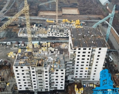 В секция Б2 устанавливают перекрытие над десятым этажом и вертикальные конструкции одиннадцатого этажа. Каменщики укладывают внутренние перегородки на седьмом этаже.